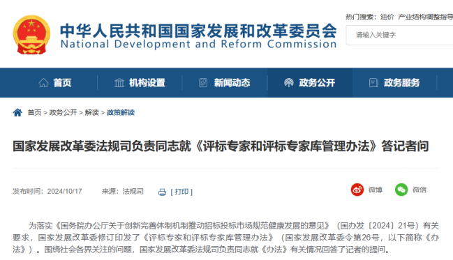 近日,國家發(fā)展改革委修訂印發(fā)了《評標專家和評標專家?guī)旃芾磙k法》(國家發(fā)展改革委令第26號,以下簡稱《辦法》)。 圍繞社會各界關(guān)注的問題,國家發(fā)展改革委法規(guī)司負責(zé)同志就《辦法》有關(guān)情況回答了記者的提問。